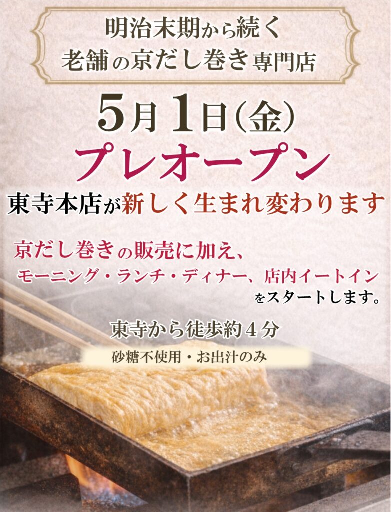 このたび東寺本店は、これまでのだし巻き販売に加え、店内でゆっくりとお食事を楽しんでいただける形へと営業内容を拡充し、2026年5月1日(金曜日) にプレオープンいたします。
